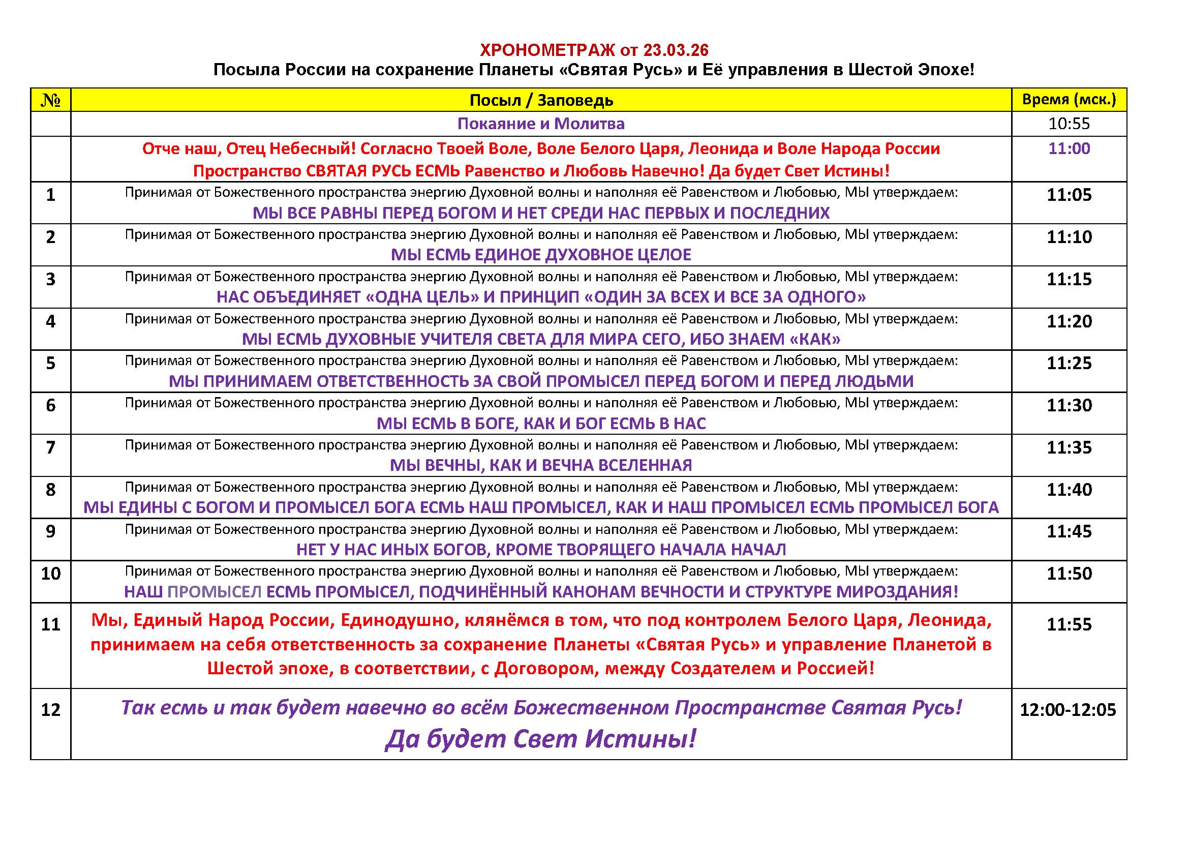 “Отче наш, Отец Небесный! Согласно Твоей Воле, Воле Белого Царя Леонида и Воле Народа России Пространство СВЯТАЯ РУСЬ ЕСМЬ Равенство и Любовь Навечно! Да будет Свет Истины!”